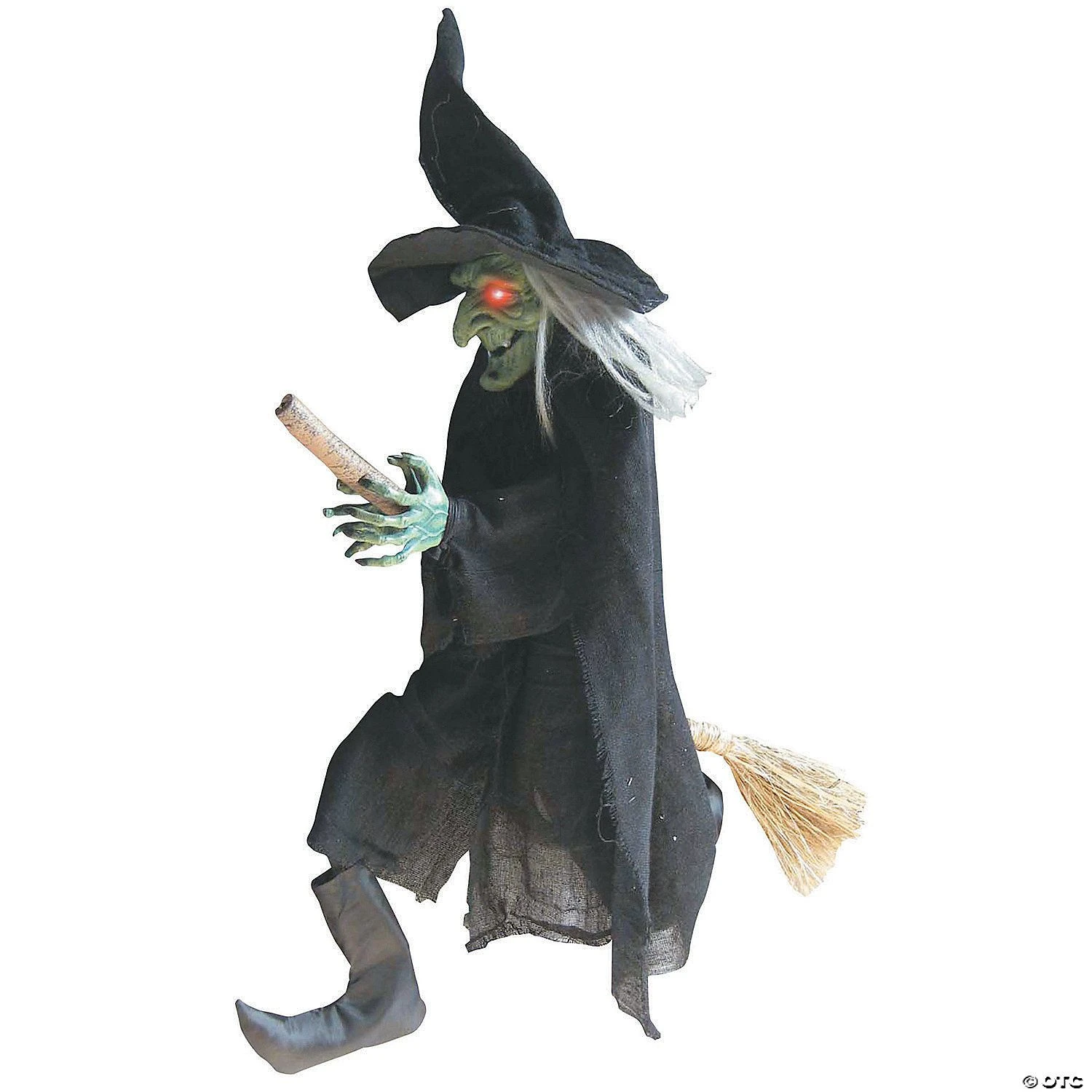 Hanging Green Faced Witch on a Broom light up eyes and laughing sound requires 2 AA batteries (not included) Size: L40 inches X W32 inches X T10 inches