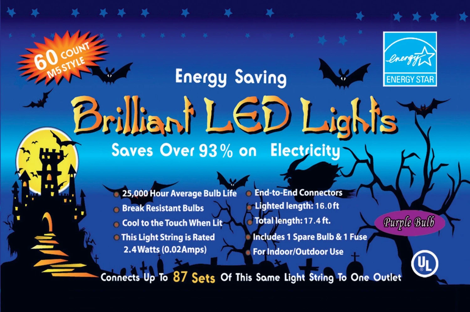 Our Energy Star rated 60-light LED Halloween Light String has a 12-inch lead wire with 4 inches between each light, and a 4-inch end wire. The lighted length is 10 feet, with a total length of 14.8 feet. Break-resistant bulbs are Cool to the touch when lit. Light String is rated at 4.8 watts, 0.04 amps per set, and includes a120v fuse, with one sparebulb and one spare fuse. End to End connectors allows as many as 43 sets of this same Light String to be serviced by one outlet! Available in colors Orange and Purple.