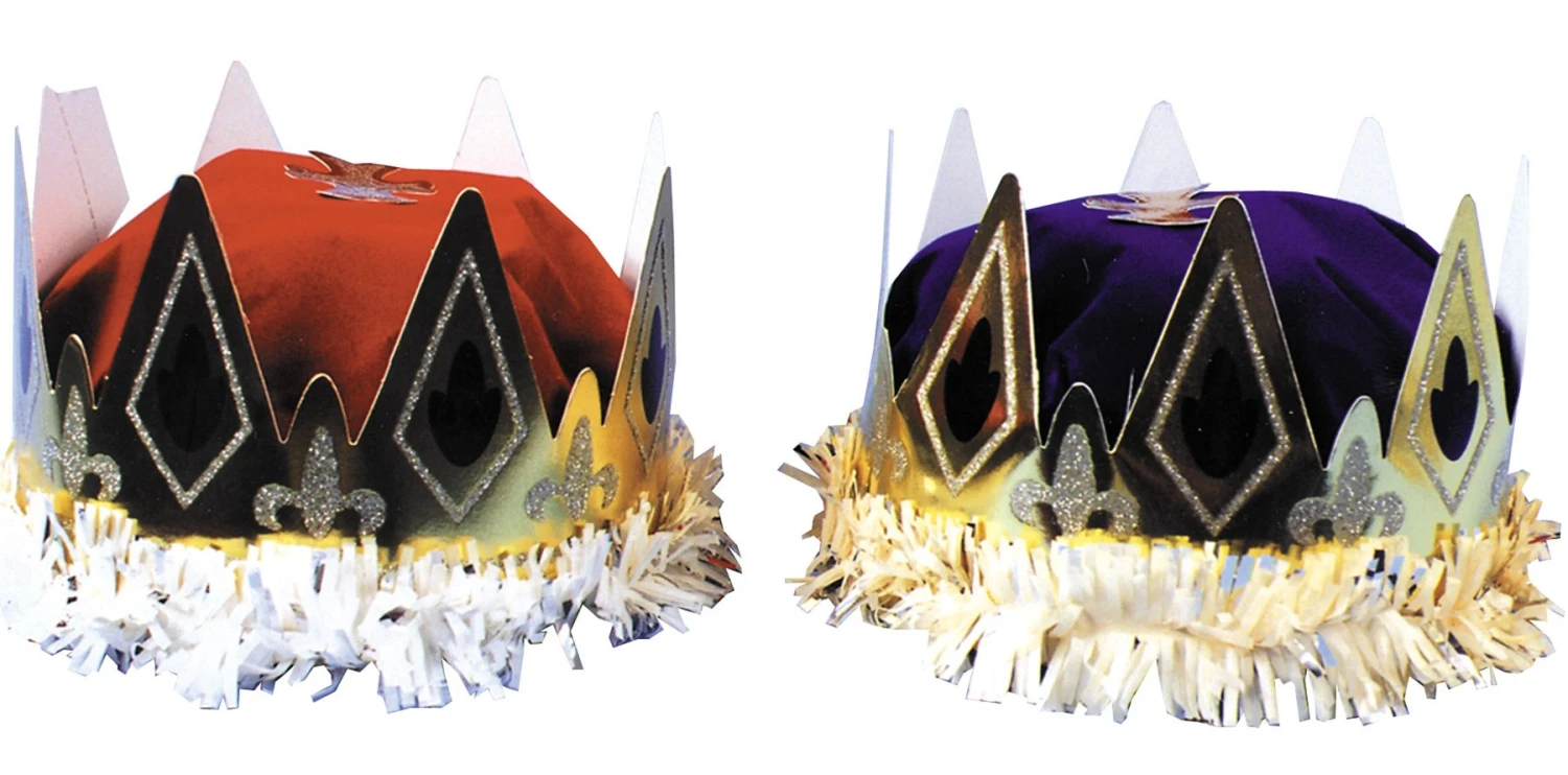 Regal queens crown is made of shiny gold foil and lovely soft flocking on crown. Edged with glitter and white fringed tissue.