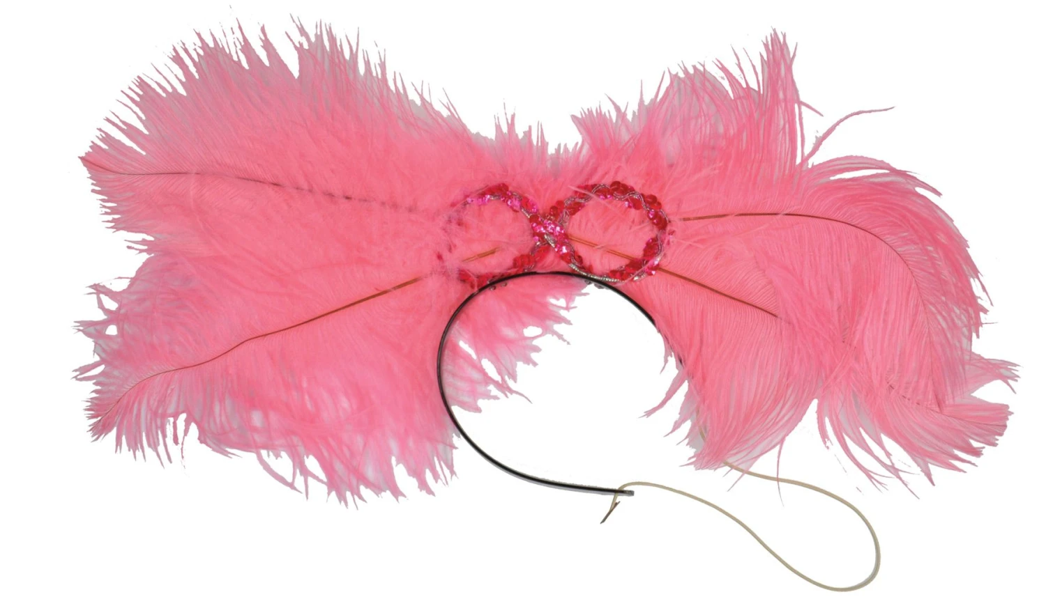 Ribbon design with sequins and large, full feathers. A must, have for the old west saloon girl or Moulin Rouge dancer.