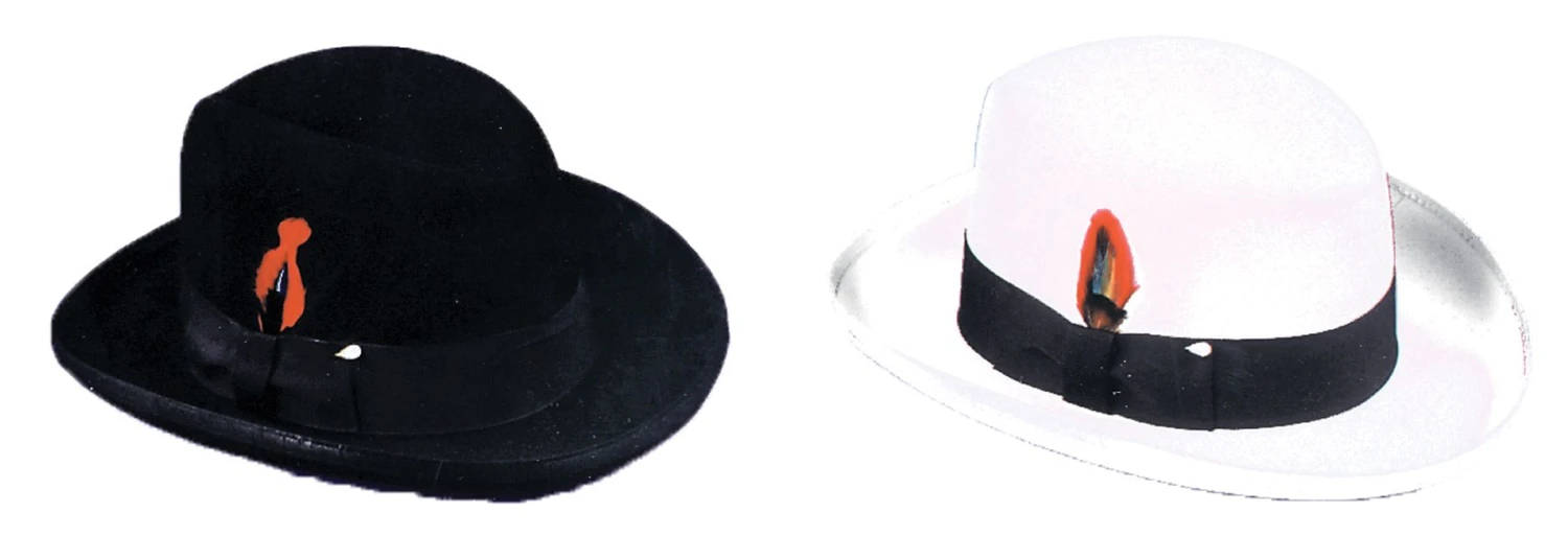 Felt hat with coordinating band and feather on side. Excellent for any member of the Mob. Brim measures 2 1/2 inches front, 2 inches side. Height 5 inches.