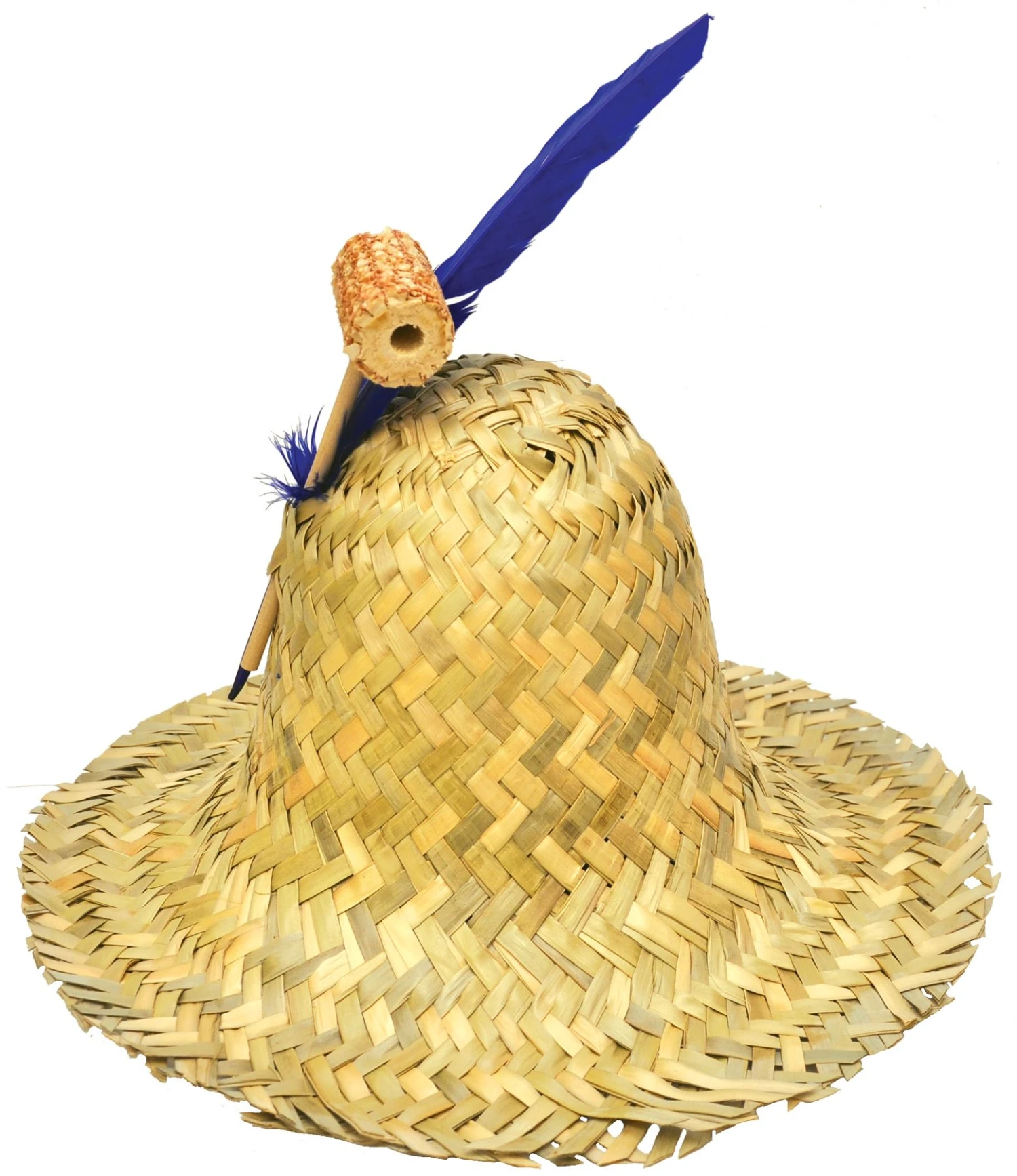 Real straw with feather and corncob pipe. One size. Brim 3 inches, height 7 1/2 inches.