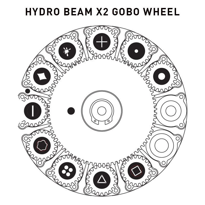 • 1 GOBO Wheel with 5 glass GOBOs, 3 metal GOBOs and 3 GOBO reducers + open