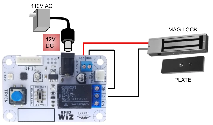 1. Hold the trained tag in front of the red RFID reader board. The relay will click and the relay LED will light up.