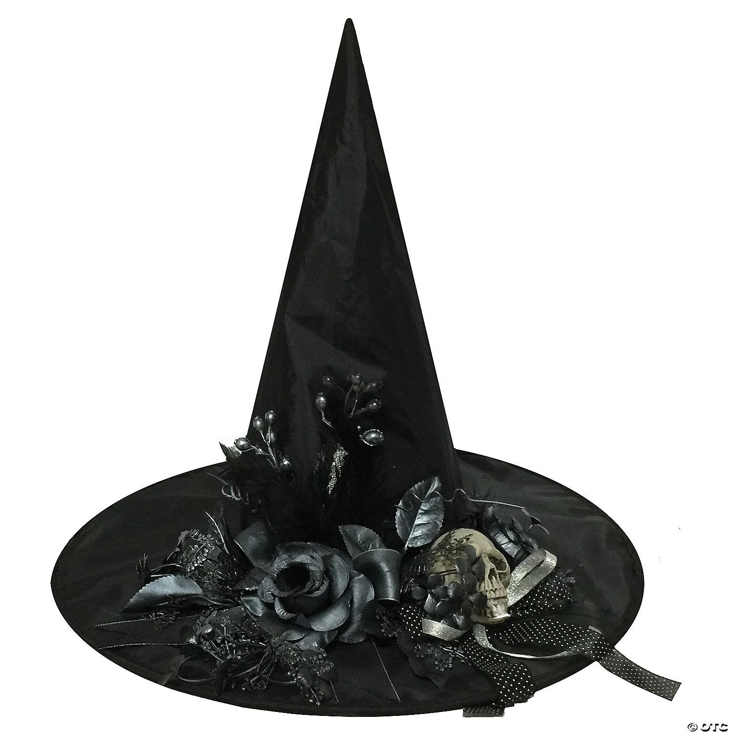 A great finishing touch for any witch costume! Sure to garner a lot of attention from the other witches. Black satin-look hat with tiny skull resting among fake flowers. This measures approximately 18.9in x 18.9in x 15in